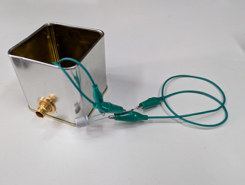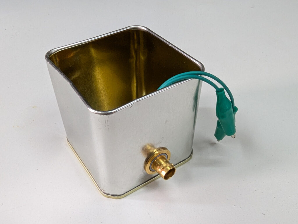 In addition, I created a simple enclosure to keep noise to a minumum. I used a small metal can that I borrowed from the kitchen. I soldered a triax connector to it and two crocodile leads. Yes, the setup isn’t ideal as there will be some leakage but again this isn’t electrometer-level measurements.