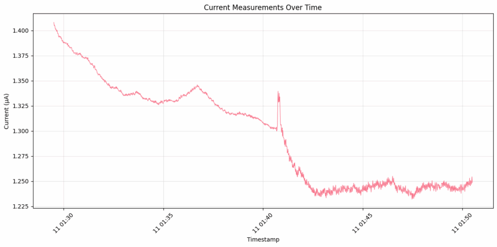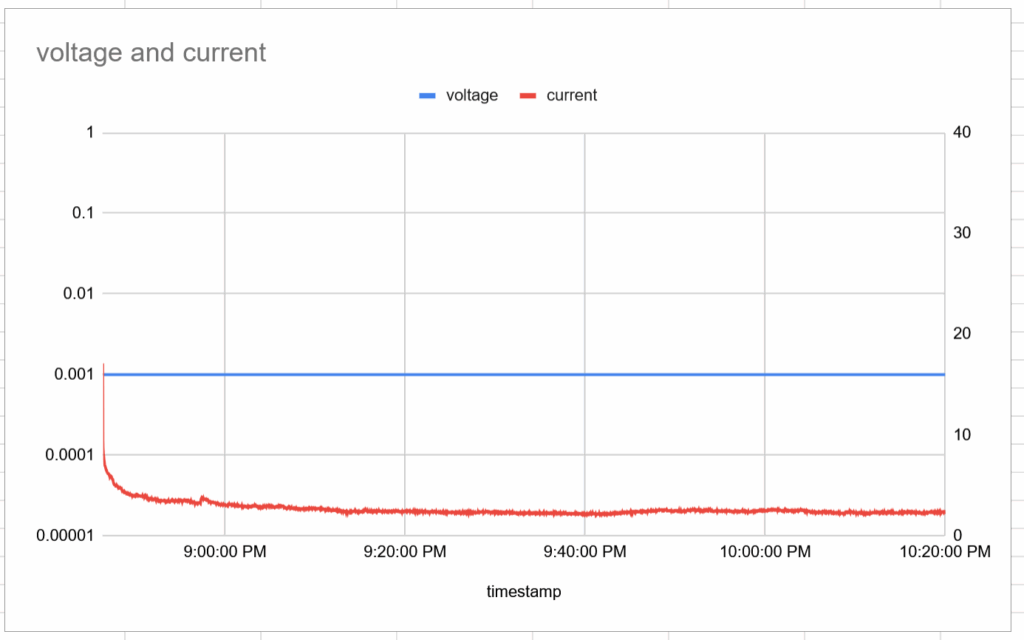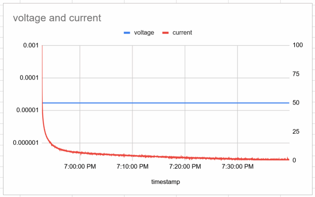 In this case, we can see a much higher leakage current. It took a little less to stabilize. There are some fluctuations that can be attributed to ambient temperature. In the end, the final measured current was 1.9919e-05 A, or 19.91µA. Significantly more than the previous capacitor, but completely expected. Leakage current increases with capacitance.