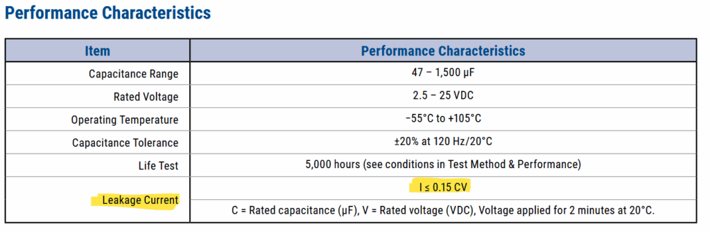This is very far from our 19uA but this is probably due to temperature. The datasheet does not specify temperature but the capacitor is rated for 105°C, so it’s very likely that the leakage current is specified for this temperature.