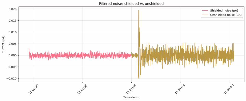 Shielded | 8.224e-10 A (0.001 µA) | 8.189e-10 A (0.001 µA) |
